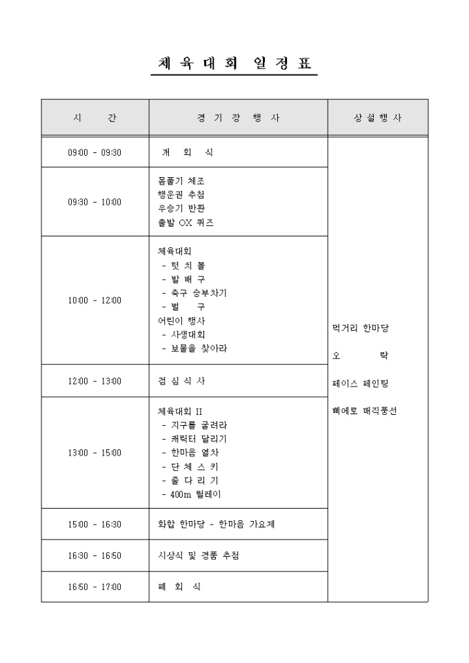 9,000원/월체육대회 시 시간별로 일정을 기록해 놓은 일정표 샘플 양식입니다.