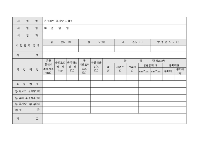 9,000원/월시험명, 시험일, 시험자, 시험일의 상태, 시료, 시방배합, 측정번호, 겉보기 공기량, 골재 수정계수, 평균의 항목을 기입할 수 있는 콘크리트 공기량 시험표 양식입니다.