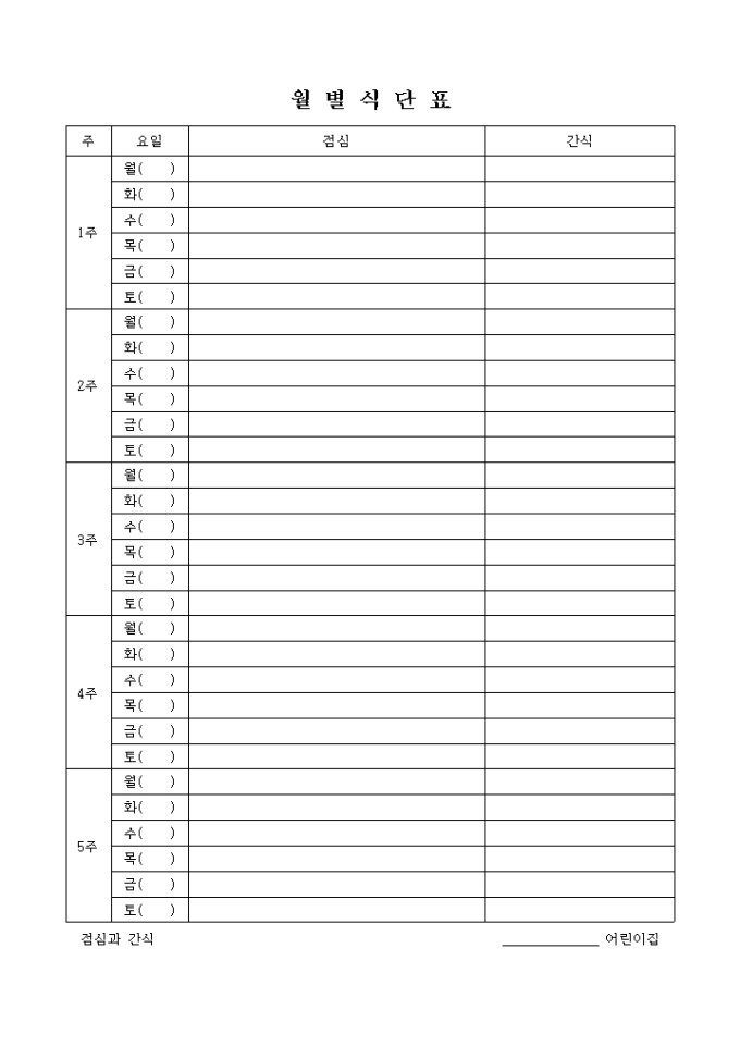 9,000원/월월별 점심과 간식을 기재하는 식단표 입니다.