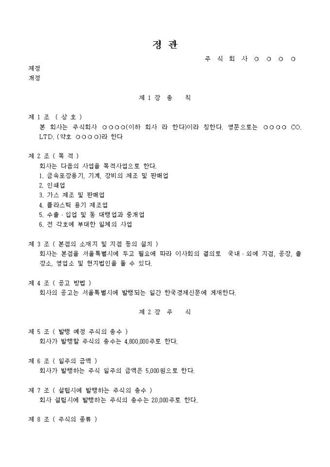 정관_금속포장용기, 기계, 장비의 제조 및 판매업