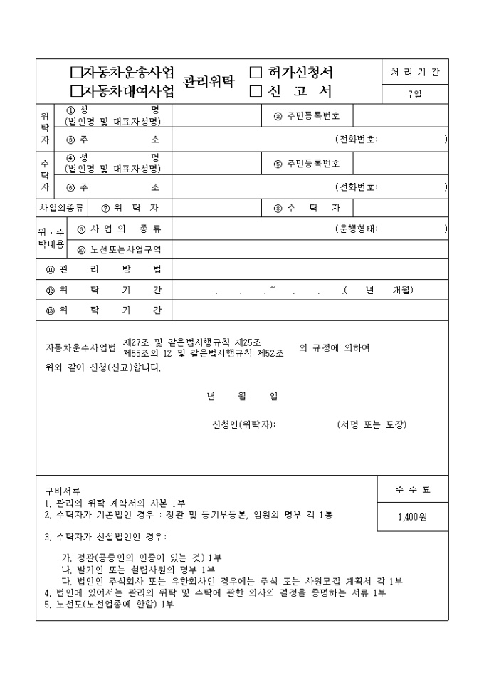 자동차 운송사업(자동차대여사업)관리위탁 허가신청서(신고서)