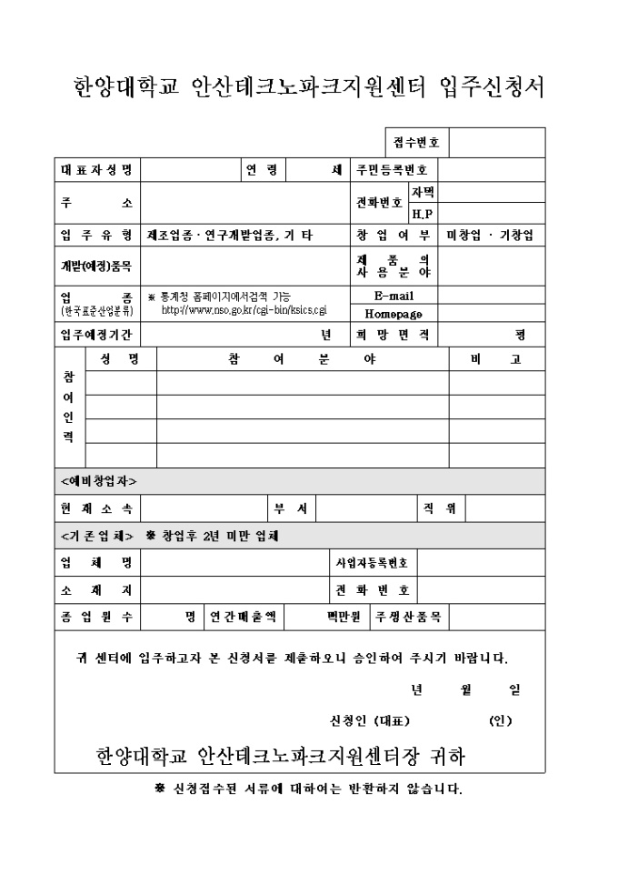 테크노파크 지원센터 입주신청서(테크노파크 지원센터)