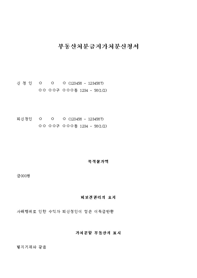 부동산 처분금지 가처분 신청서(사해행위로 인한 수익자 피신청인이 얻은 이득금반환)