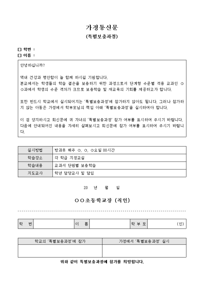 가정 통신문(특별보충과정)(샘플)