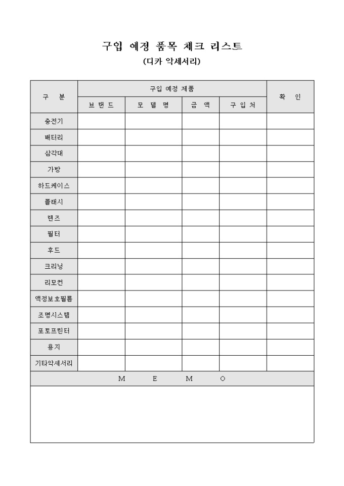 구입 예정 품목 체크 리스트(디카 악세서리)