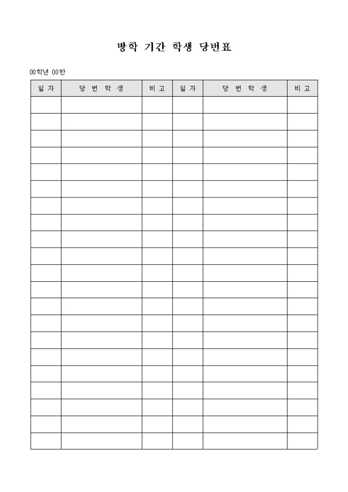 방학 기간 학생 당번표