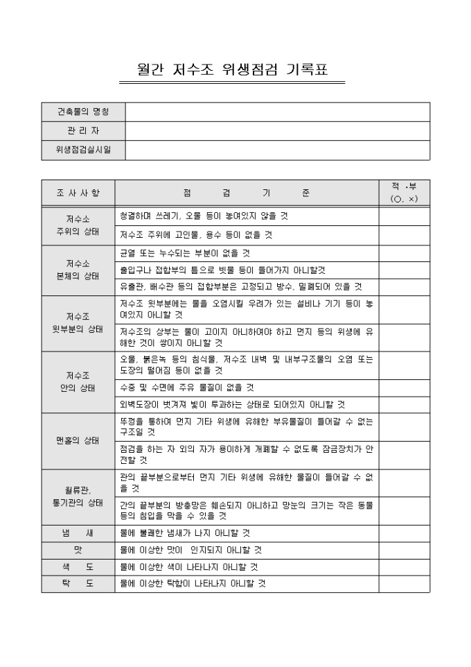 월간 위생점검 기록표(아파트 저수조)